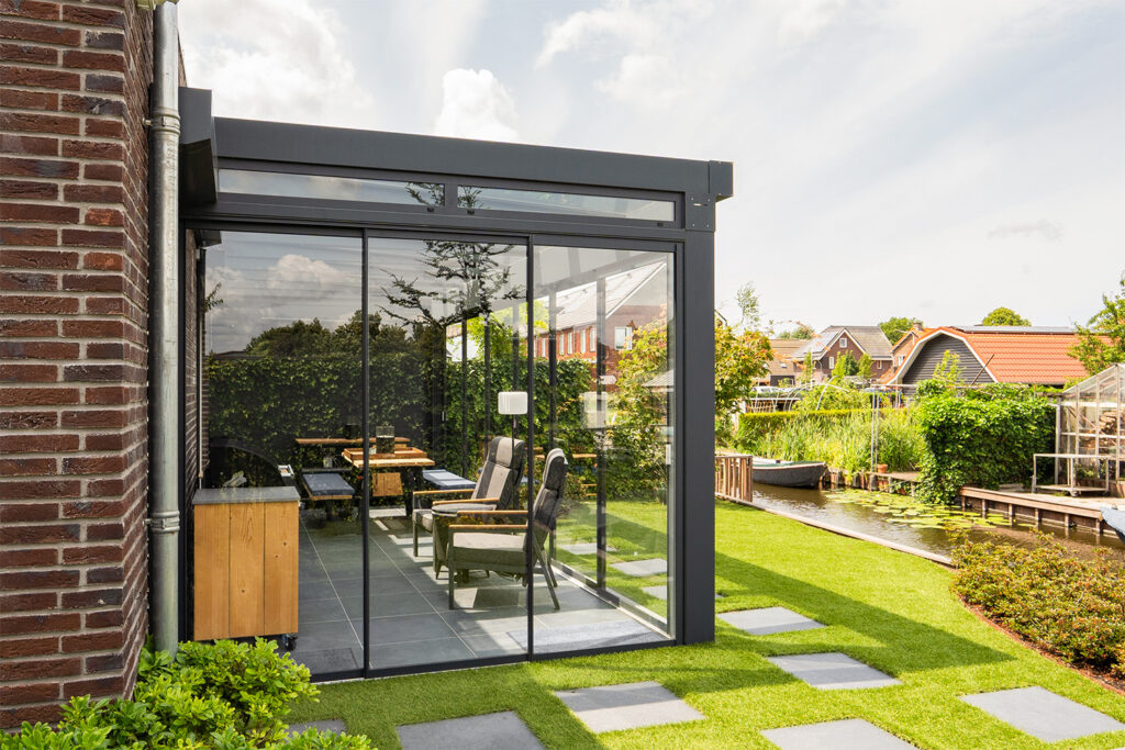 Geniet van een ononderbroken terrasbeleving met Totaaloverkapping. Onze op maat gemaakte aluminium kozijnen met glas zorgen voor optimale windbescherming en lichtinval, waardoor u van uw overkapping het hele jaar door kunt genieten.