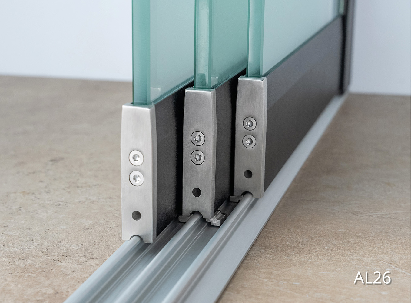 AL26: Extra sterke rails inclusief afwatering en innovatief meeloopsysteem. De wieltjes staan op de sporen (totale hoogte 15 mm, drempelloos)